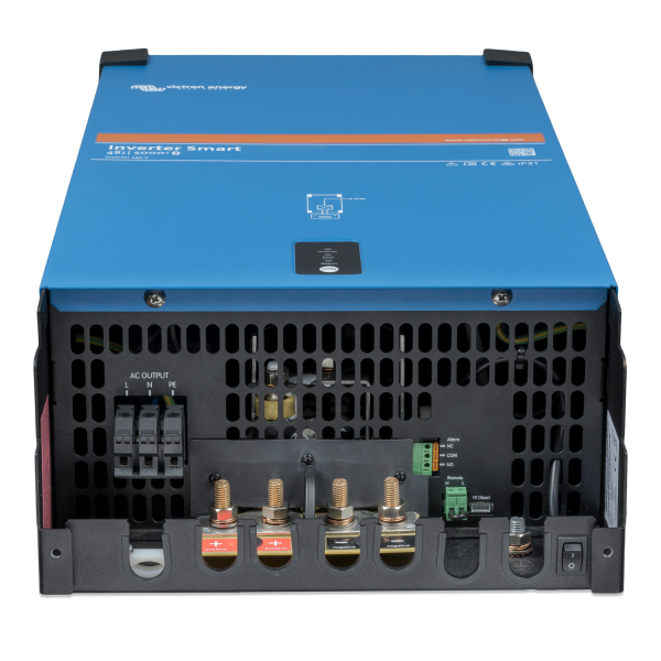 Invertorul 48/5000 Smart este un invertor eficient si fiabil. Construit pe platforma Victron de invertoare Phoenix, cu fiabilitate dovedita si testata pe teren, este disponibil acum cu un nou design mai subtire si carcasa metalica completa. Modelele sunt disponibile in variantele de 1600 VA, 2000 VA, 3000 VA și 5000 VA pentru sisteme de 12, 24 sau 48 V. Este suficient de puternic pentru a alimenta cele mai frecvent intalnite dispozitive din automobil, ambarcatiune, rulota sau casa dvs. Un transformator toroidal asigura tensiune stabila, frecventa si unda sinusoida de inalta calitate cat si protectie la supratensiune. Instalarea este mai simpla decat oricand, terminalele fiind acum mai accesibile pentru instalator. Bluetooth-ul este optiune standard si faciliteaza configurarea invertorului.