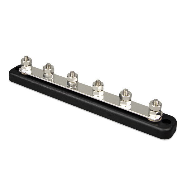 Într-un sistem electric bine proiectat, ordinea și calitatea contactului electric sunt prioritare. Atunci când avem un regulator MPPT, un invertor, un încărcător DC-DC și câțiva consumatori mari, este imposibilă fixarea tuturor acestor papuci de cablu pe un singur șurub de baterie. Victron Busbar 150A 6P preia sarcina de a distribui energia către șase puncte distincte.